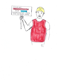 Toelichting bij het cartoon: Het rode vest staat voor onnodig bloedvergieten door al die regime changes die Amerika doorvoert en complete landen in geweldzones, extreme armoede en ellende achterlaat terwijl de multicriminationals gaan lopen met de belangrijkste grondstoffen. De gele veiligheidshelm staat voor jouw persoonlijke veiligheid waarbij je voor alle zekerheid ook een gelaatscherm kunt opzetten. (tegen bijvoorbeeld traangas of rubberkogels). De staat met hun geweld(ad)ige politie deinst er niet voor terug om zwaar geweld te gebruiken tegen de eigen burgers die het zat zijn uitgemolken te worden door hun eigen regering, die er enkel is voor een kleine elite.